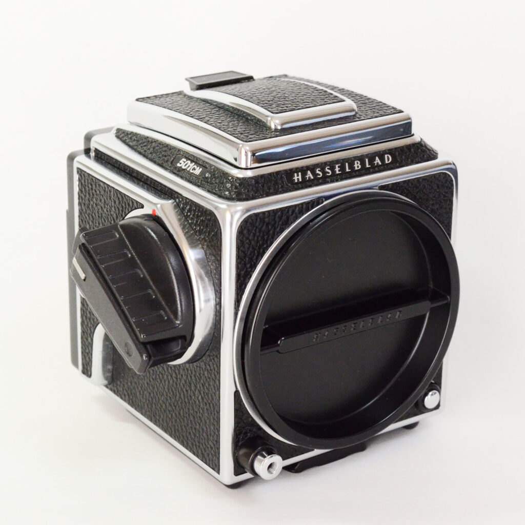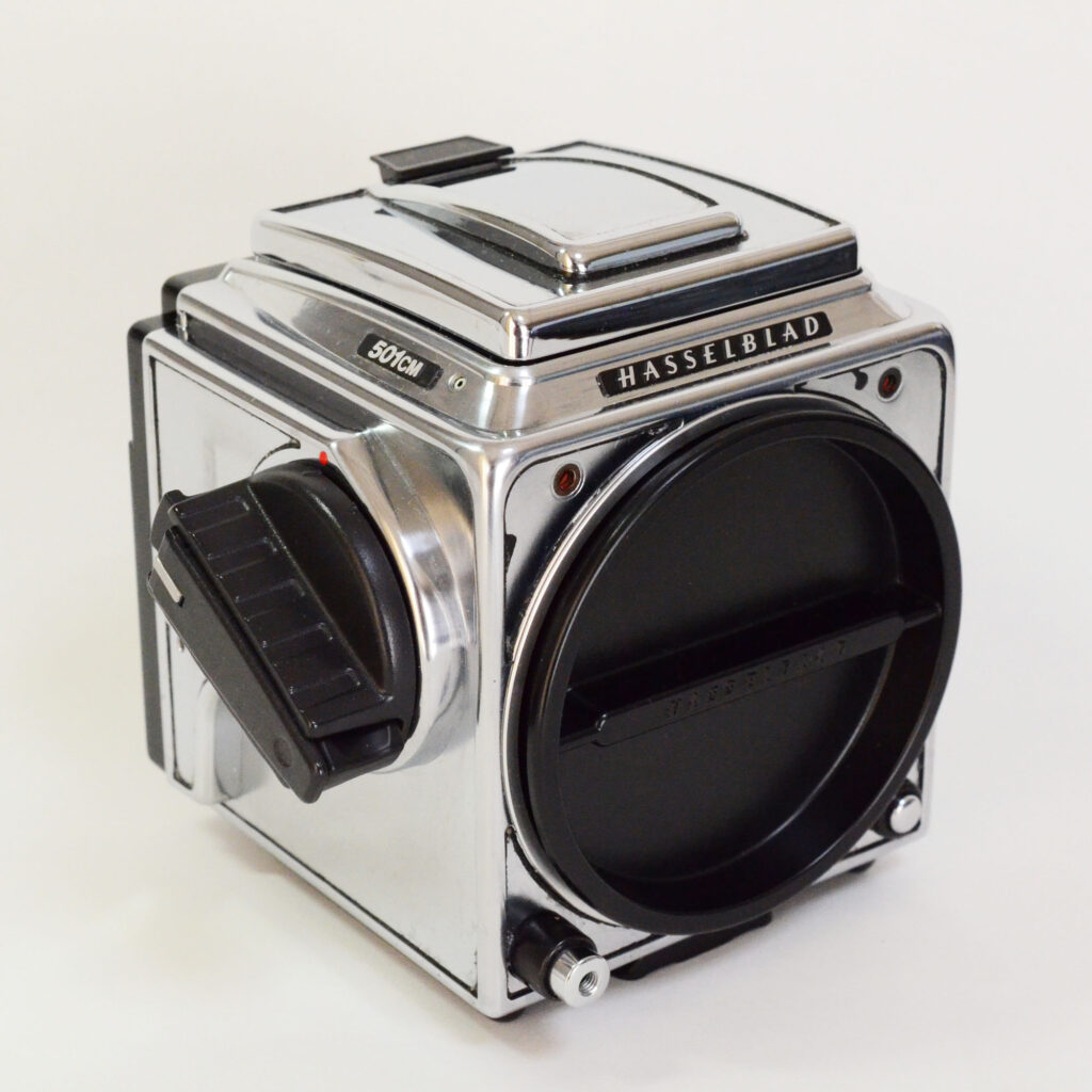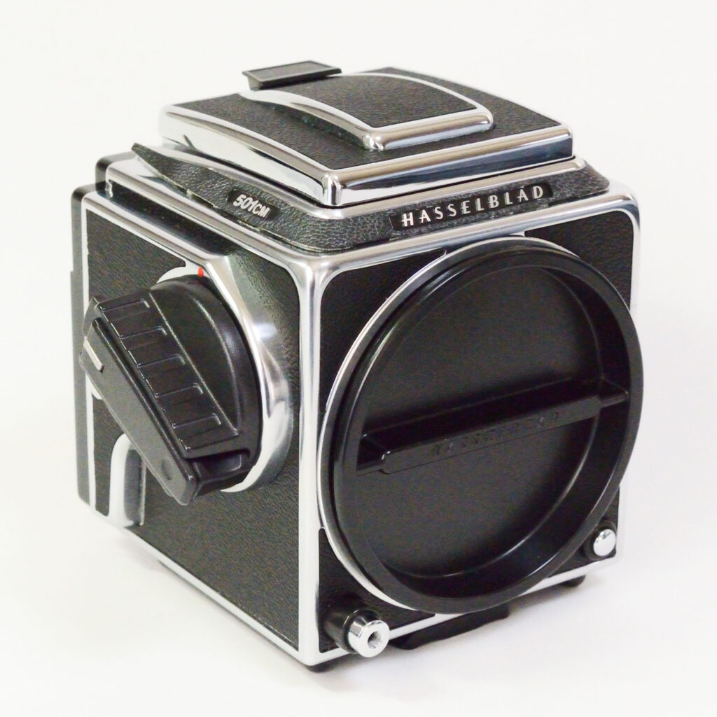 右の写真は、501CMの貼り革を取り除く前の状態です。レンズもフィルムバックも無いカメラ本体だけの写真で、黒い部分が貼り革です。サイト掲載写真では細部が分かりませんので何でもないように見えるかもしれませんが、実際には所々剥がれていたりズレていたりしています。